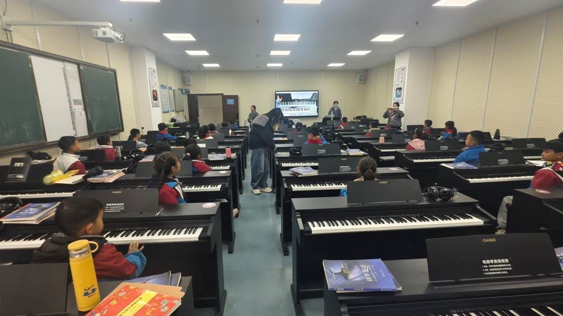 “音乐魔法屋”钢琴体验区更是充满了欢乐与惊喜。老师以画廊画作为灵感,用音符勾勒艺术画卷,带领孩子们欣赏儿歌《粗心的小画家》,随后组织大家一起练习弹奏经典儿歌《两只老虎》。孩子们在趣味游戏中学习基础乐理知识,亲手触摸琴键感受弹奏乐趣,对音乐与钢琴的兴趣被深深点燃。