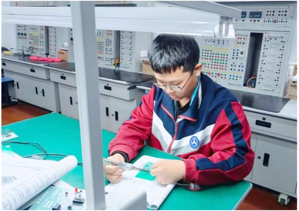 他一直相信“多练才能出真本事”。课余时间,他把实训室当成了“第二个教室”,专门练习接线速度、焊接工艺这些实用技能。最开始接线速度很慢,后来慢慢练到能在规定时间里精准接好复杂电路;以前焊接的焊点要么粗糙、要么不均匀,现在能焊出既好看又牢固的焊点——每一点进步,都是他一遍遍地练习、一遍遍地修改换来的。